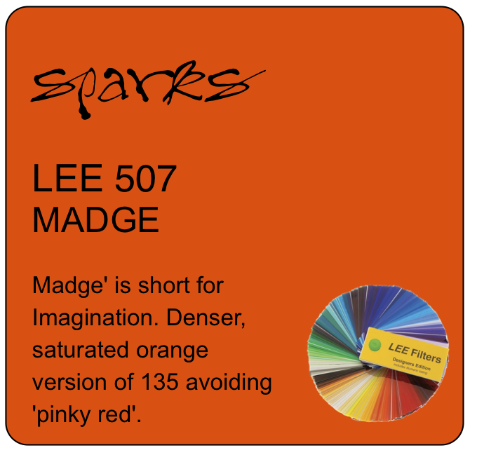 Madge' is short for Imagination. Denser, saturated orange version of 135 avoiding 'pinky red'.